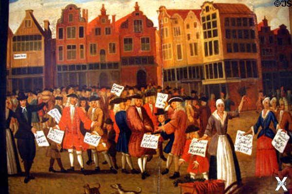 Возможно, это самый необычный эпизод в нашем списке. Тюльпаномания считается самым первым задокументированным экономическим пузырём в истории. Появившись в Нидерландах в начале XVII века, тюльпан сразу же завоевал популярность. Голландские граждане стали просто одержимыми желанием приобрести свежий тюльпан. Так как тюльпаны растут лишь в определенное время года, поэтому голландцы создали фьючерсный рынок. То есть, когда тюльпаны нельзя было приобрести, желающие покупали права на луковицы тюльпана, которые должны были появиться в будущем.