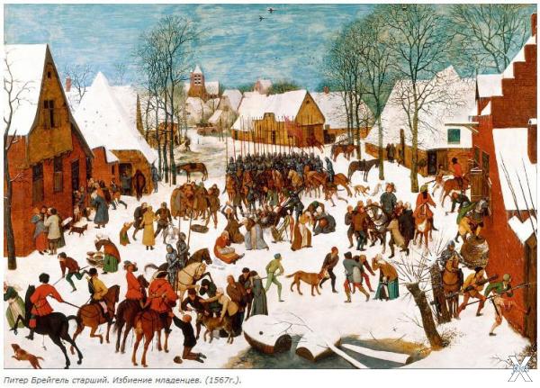 И вновь европейская архитектура, флора и климат. Снег и зима. Если неграмотные художники, которые отчего - то враз, кинулись писать картины на библейские темы через полторы тысячи лет спустя, и не знали о том, как жили в Палестине, то почему они так дружно изображают снег на улицах и крышах? Думается мне, только по одно причине. Они в своё время, ещё точно знали когда именно и где именно происходили эти события.