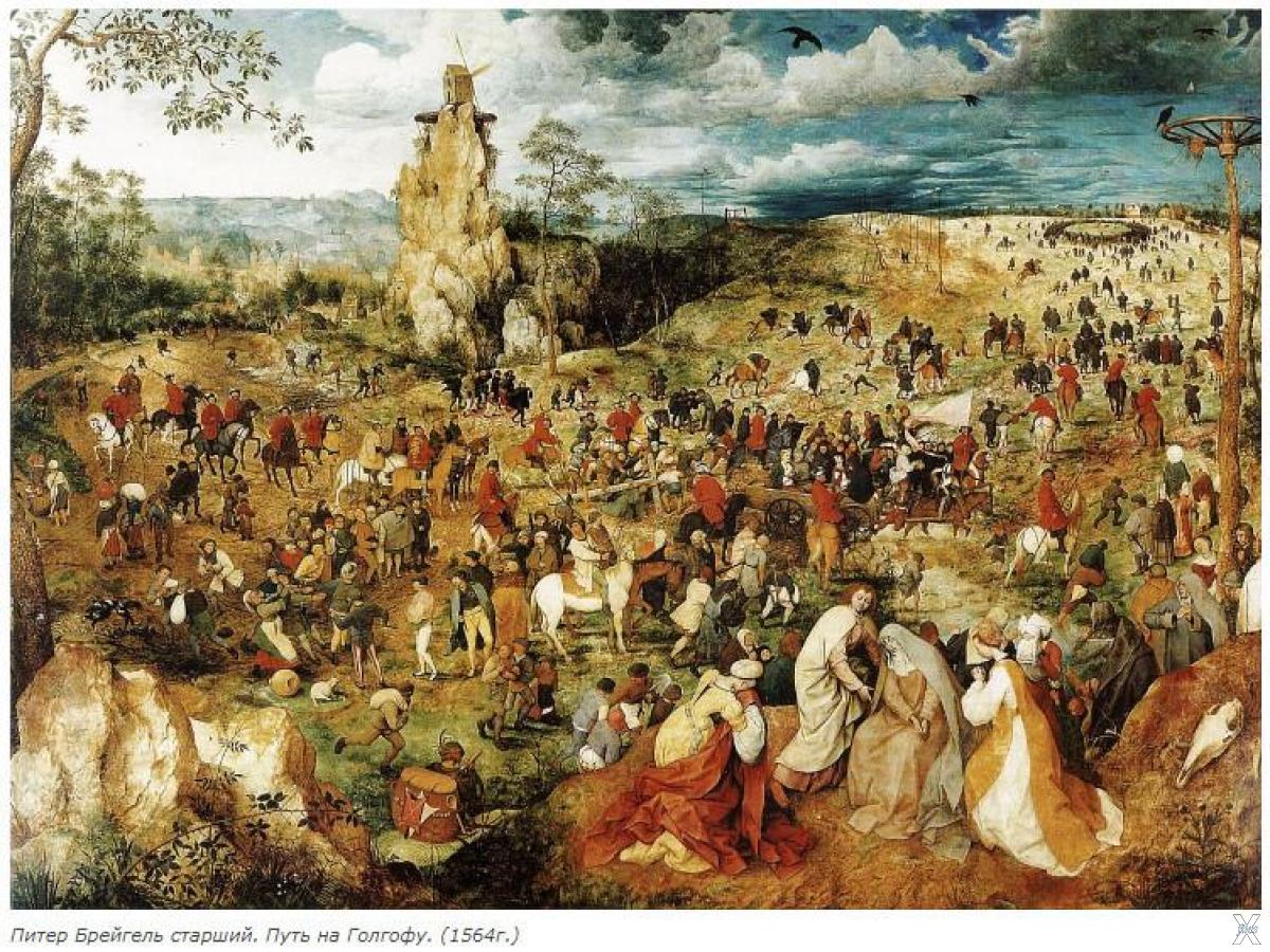 Эта картина настоящий кладезь. Она одна достойна отдельной статьи, поэтому не стану останавливаться подробно, отмечу лишь, что на этом полотне, мы вновь видим типичный русский пейзаж, русских казаков, которые везут на телеге страдающего Иисуса к Лобному месту, и даже непременный атрибут русской деревни – гнездо для аистов в виде заготовки из поломанного колеса от телеги.