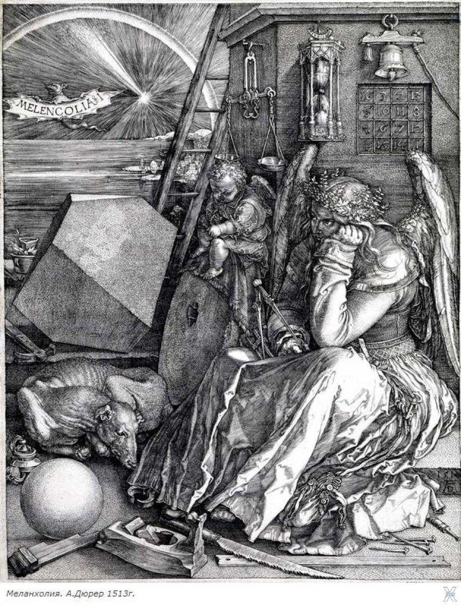 Крылатую женщину, пребывающую в состоянии меланхолии (это когда не просто грустно, а когда всё, конец) окружают предметы: измерительные, столярные инструменты, а у ног лежит шар... Символизм легко угадываемый. Тут тебе и набор предметов из арсенала Вольных каменщиков, строителей мира, и символ планеты, и яркий свет свыше.