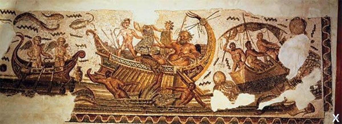 Дионис изгоняет пиратов из Тирренского моря. Впрочем, богу не удалось полностью очистить воды от морских разбойников, эта проблема осталась в наследство римлянам