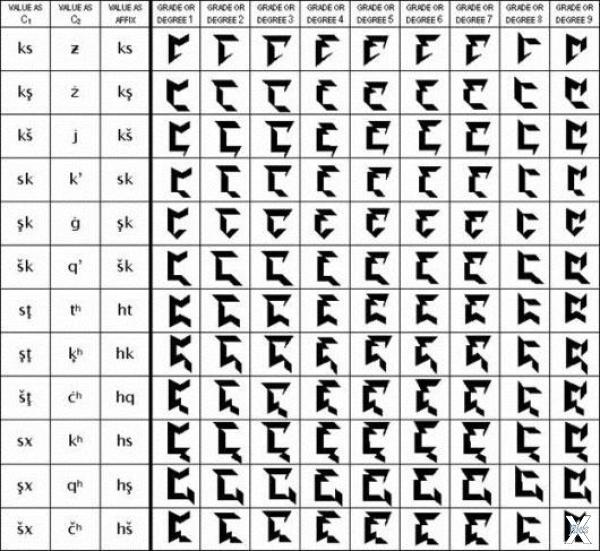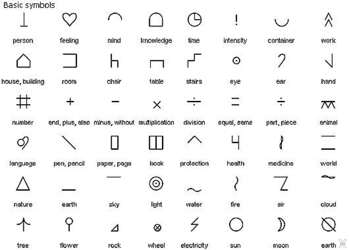 Одни из символов были пиктографическими (физические объекты, например, дом или Солнце), другие – идеографическими (олицетворяли такие идеи, как разум или акт дарения). Эти символы легко рисовались и обозначали сложные понятия, что позволило бы людям, говорящим на разных языках и принадлежащим к разным культурам, эффективно общаться между собой.