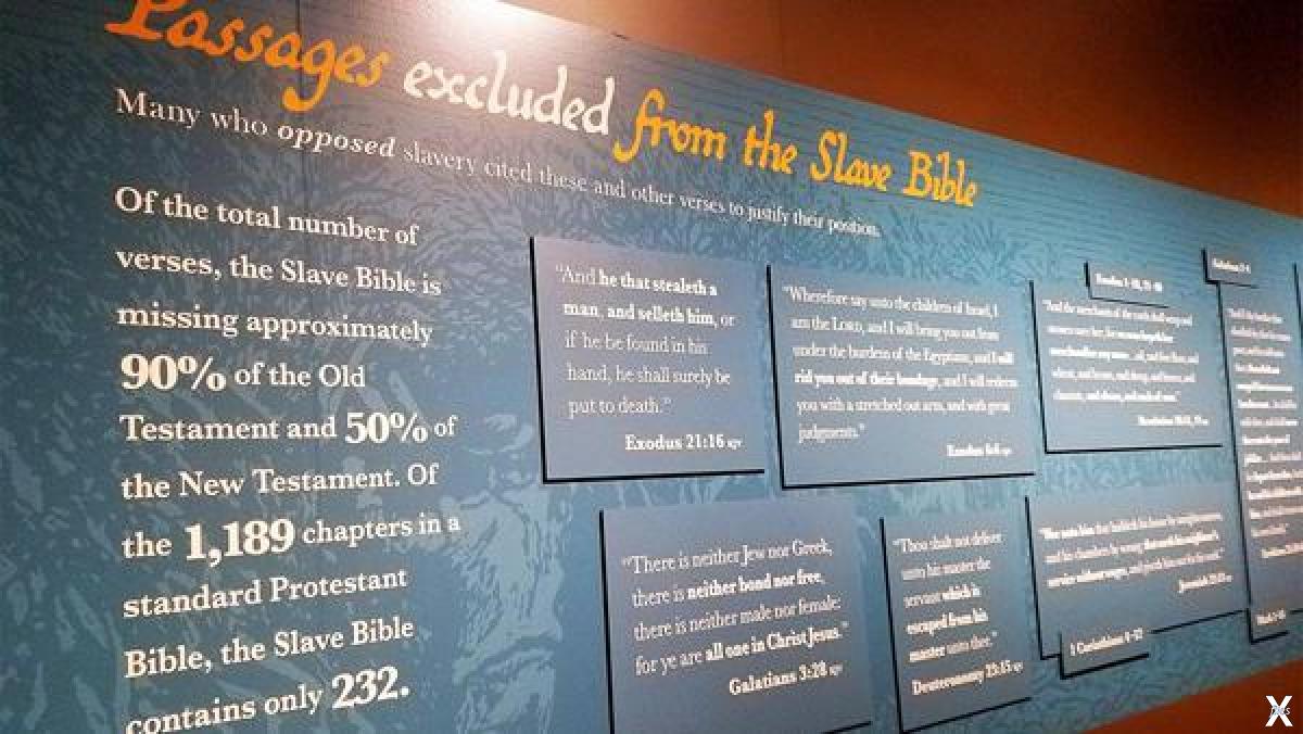 На первом этаже Вашингтонского Музея Библии есть одинокий том, который выделяется из множества других версий Священного Писания. Это небольшой набор фрагментов, извлеченных из канонического варианта библейского текста. Название экспоната гласит: «Части Библии, избранные для использования рабов на Британских Вест-Индийских островах».