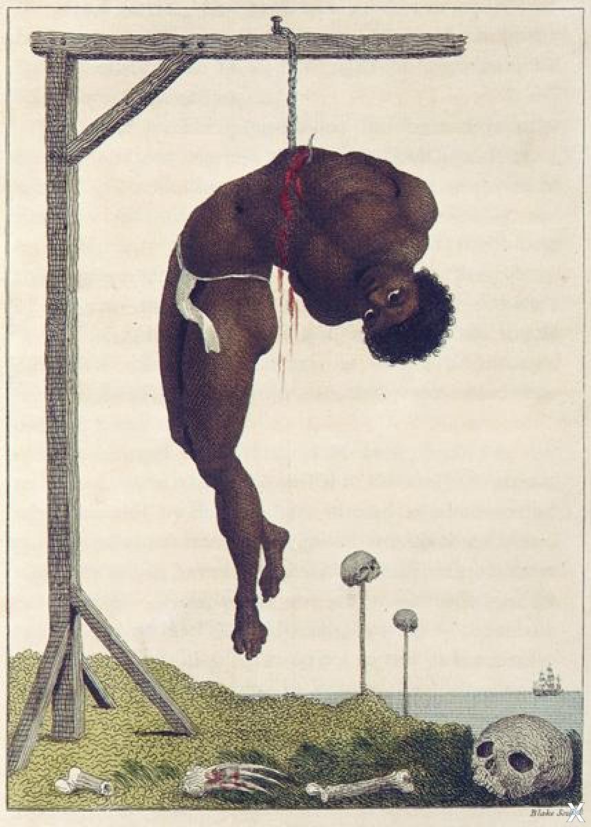Уильям Блейк. Негр, подвешенный живым за ребра на виселице, 1796 г. Великобритания. Работа основана на рассказе голландского солдата Стэдмена – очевидца подобной жестокой расправы