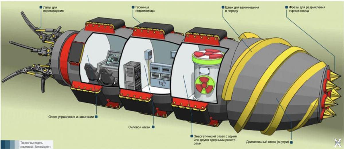По имеющимся данным, странный немецкий механизм нашли агенты Берии, после чего его проанализировала инженерная команда. Вспомнили и про работу Требелева. Отцом-идеологом же советской подземной лодки называют Никиту Хрущева. Крючков говорит, что советскую машину «Боевой крот» построили в первой половине 60-х на Украине вблизи поселка Громовка (Крымская область). Она получила ядерную силовую установку, позволявшую передвигаться со скоростью 7 км/ч. Длина аппарата составляла 35 м, а экипаж – 5 человек. Кроме этого, «крот» мог нести пятнадцать человек десанта и одну тонну взрывчатки. Все это было нужно для уничтожения подземных бункеров и ракетных шахт западных союзников. Если быть точней, машина должна была скрыто проникнуть под территорию Калифорнии и заложить ядерные заряды под стратегическими объектами. Действия «Боевого крота» могли принять за землетрясение, что дало бы козыри в руки СССР.