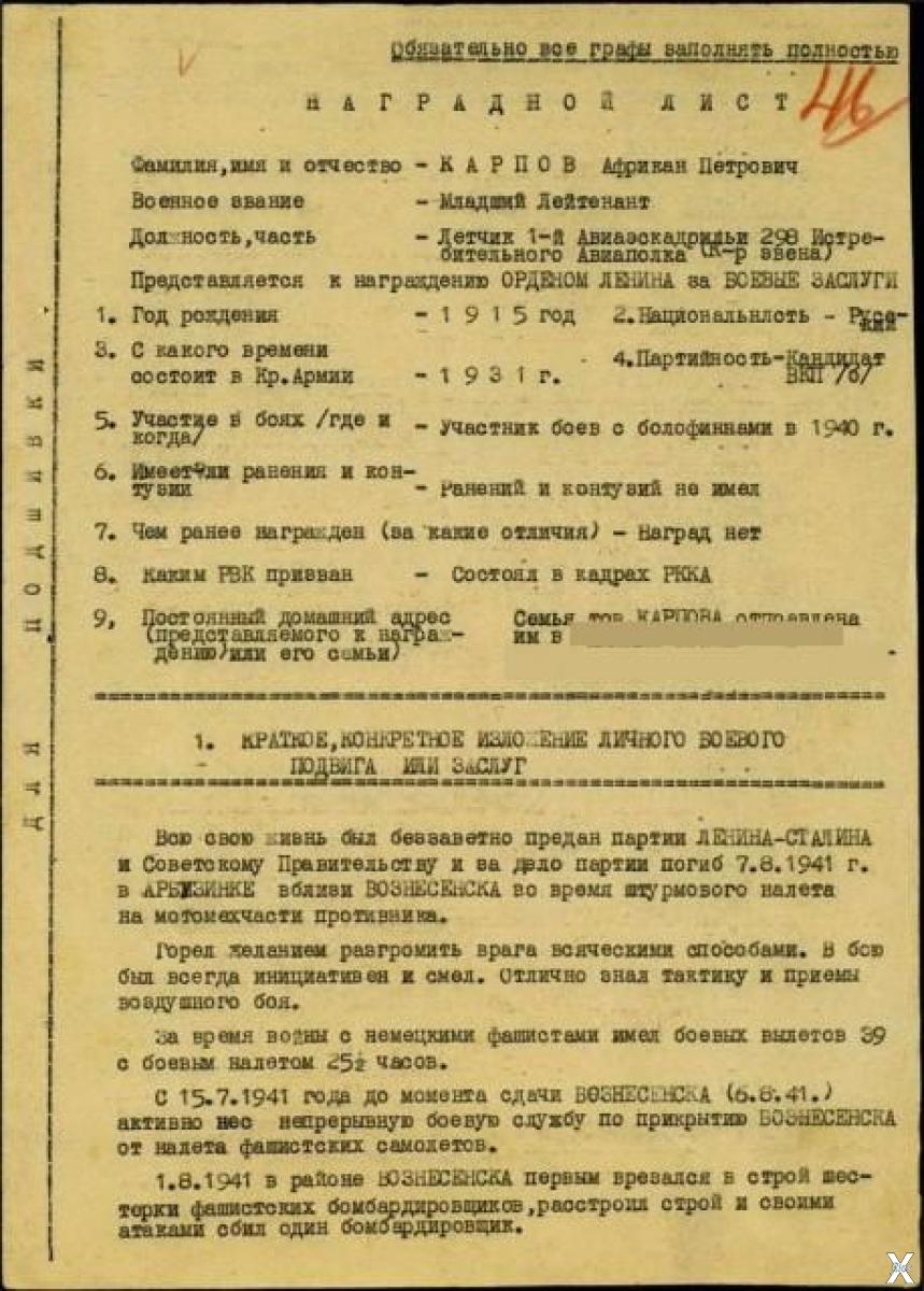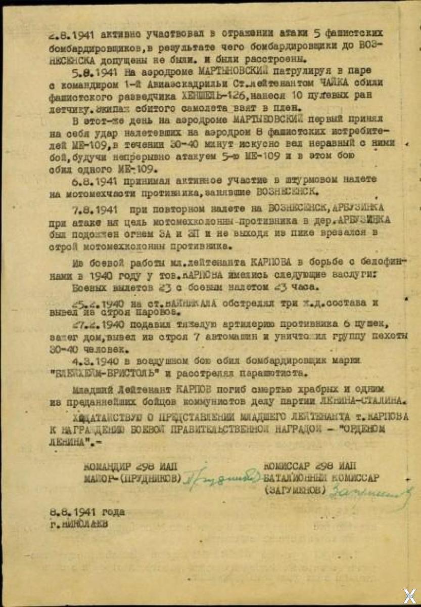 «…Командир звена 1-й авиаэскадрильи 298 ИАП мл. лейтенант Карпов Африкан Петрович, 1915 г. р., русский, в РККА с 1931 г., … 07.08.1941 г. при повторном налете на Вознесенск, Арбузинку при атаке на цель мотомехколонны противника в дер. Арбузинка был подожжен огнем ЗА и ЗП и, не выходя из пике, врезался в строй мотомехколонны противника. Ходатайствую о представлении мл. лейтенанта т. Карпова к награждению боевой правительственной наградой – орденом Ленина. Командир 298 ИАП майор Прудников, батальонный комиссар Загуменов. 08.08.1941 г., г.Николаев».