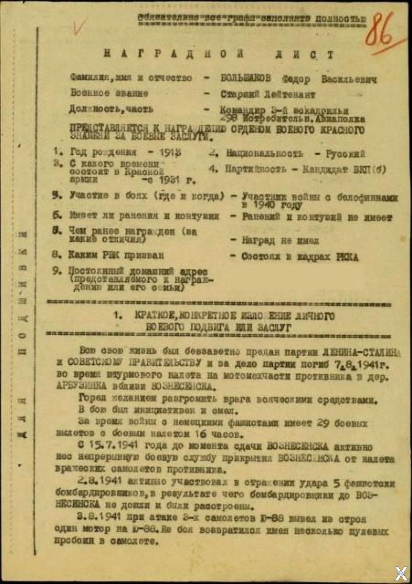 «…Командир 3-й авиаэскадрильи 298 ИАП ст. лейтенант Большаков Федор Васильевич, 1913 г. р., русский, в РККА с 1931 г., .07.08.1941 г. при повторном налете на мотомехчасти противника в Вознесенске и Арбузинке при атаке колонны в дер. Арбузинка был подожжен огнем ЗА и ЗП и не выходя из пике врезался в колонну противника. Ходатайствую о представлении ст. лейтенанта т. Большакова к награждению боевой правительственной наградой – орденом Красного Знамени. Командир 298 ИАП майор Прудников, батальонный комиссар Загуменов. 08.08.1941 г., г. Николаев».
