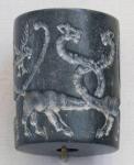Так вот, на лицевой стороне здесь изображены некие переплетённые длинношеие львы («серпопарды»), которых держат на поводках двое бородатых мужчин. Изображение симметрично расположенных пар «укрощённых» зверей, по всей вероятности, было заимствовано из иконографии раннего периода развития Месопотамии, возможно из Элама.