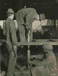 Это строительство какого-то резервуара в США, 1900 год. Объект не похож на павильон, а по рукам рабочего слева можно понять, что это не актёр. Тем не менее, он забивает внушительных размеров клёпки всё тем же лёгким молотком. А так ли это? Посмотрим увеличенный фрагмент.