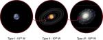 Три схематических изображения: Земля, Солнечная система и Млечный путь. Потребление энергии оценивается в трех типах цивилизаций, определенных по шкале Кардашева