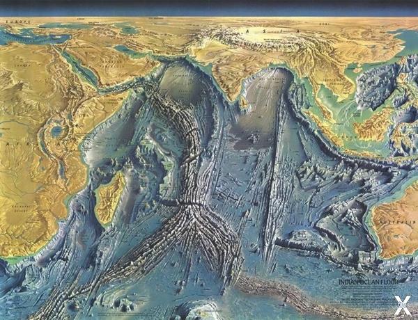 Впадина Индийского океана имеет сложное строение в связи большим разнообразием форм рельефа. В пределах Индийского океана выделяются подводная окраина материка (29,3% площади дна океана), ложе океана (51,6%) и срединно-океанические хребты (16,8%). Переходная зона развита слабо (2,3%), лишь в узкой полосе северо-восточной части океана.