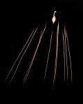 Вход в атмосферу боеголовок ракеты Peacekeeper, экспозиционные следы от пролета ярко светящихся боеголовок. Большое различие в углах наклона траектории не физическое — это особенности ракурса и перспективы. В реальности траектории расходятся в пространстве под очень незначительным углом, максимум первые градусы. Точка наблюдения расположена между различными точками падения, что и создает вид очень разного угла наклона траекторий