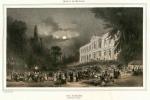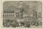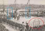 Это вообще шедевр. Обратите внимание: какой формы эфирные конденсаторы наверху над колоннами. Это сооружение настоящее, его только приспособили под иллюминацию. А вот сзади уже декорация. И ёлочки уже больше похожи на меноры. И всё обвешано какими-то шарами, видимо, на сетке. А вот на следующую гравюру смотрим внимательнее.