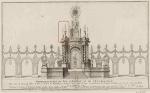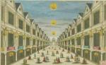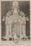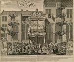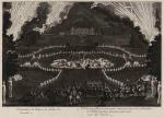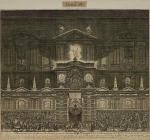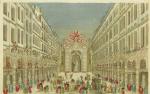 Ощущение, что гравюру кто-то подмалевал, но явно видно, что колонны зданий на первом этаже обмотаны какими-то гирляндами. Понятное дело, об использовании огня тут не может быть и речи, иначе всё махом загорится, а пожаров в те времена боялись не меньше чумы. Обратите внимание: это 1745 год, Париж.