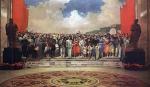 Сварог внес коррективы в руководящий состав. Ежова пришлось убрать по понятным причинам: в 1938 г. он уже оказался в опале, к началу выставки — под арестом. Не было на полотне и почившего Орджоникидзе. Освободившиеся места на холсте заняли Калинин и Ворошилов.
