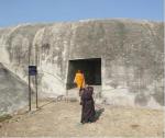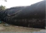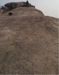 Больше всего, однако, мне стала интересна форма самой скалы, которая издалека похожа на всплывающую из-под земли гигантскую подводную каменную лодку. Причем она выделяется среди окружающих ее скал сплошным монолитом, а рядом куча скал, состоящих из огромных кусков камней. Вот там все по правилам геологии - трещиноватость гнейса так и проявляется. Но почему тогда скала Барабар до сих пор не треснула, а выглядит сплошняком, хотя и имеет в некоторых местах трещины, проходящие совсем не по законам геологии.