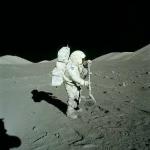 Поверхность Луны с горами на заднем плане. Астронавт с “Аполлона-17”, собирающий образцы лунного грунта. Фото НАСА