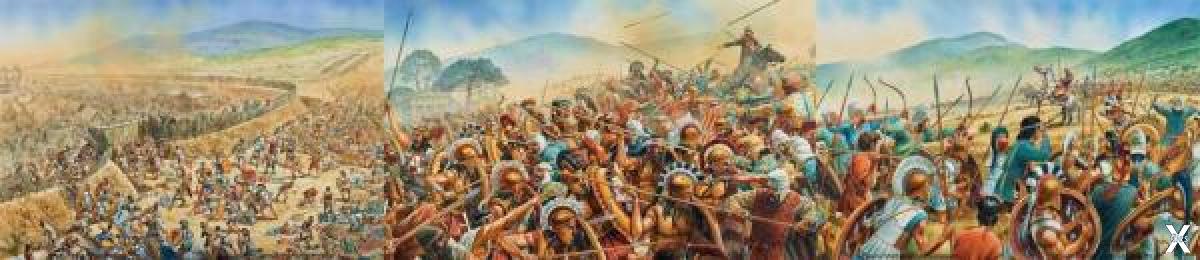 Битва при Платеях (479 г. до н.э.). В сражении между древнегреческими городами-государствами и персидской империей Ахеменидов поучаствовало свыше четырёхсот тысяч человек. Из них 300 000 персидских солдат (включая греческие батальоны) противостояли 108 200 греческим войнам (по иным данным всего участников было около 200 000).