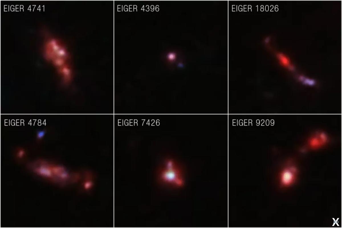 Эти шесть галактик были сфотографированы космическим телескопом Уэбб и выглядят такими, какими они были, когда Вселенной было всего 900 миллионов лет