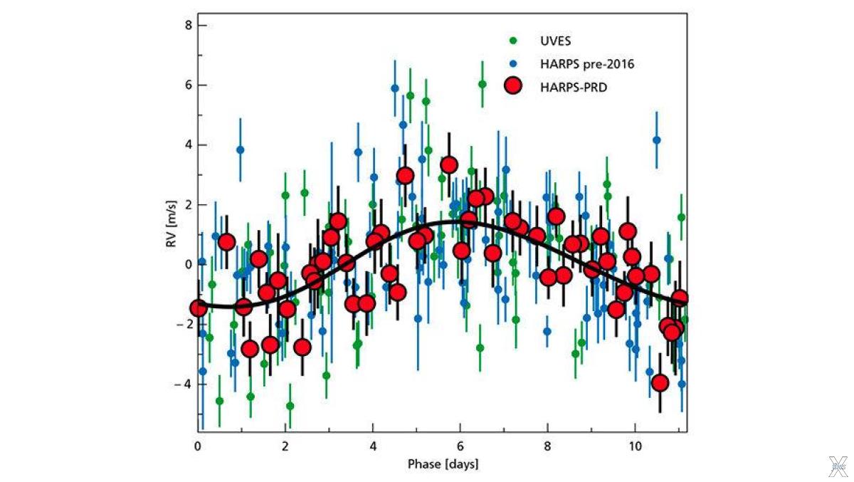 Данные, демонстрирующие открытие Проксимы b. По горизонтальной оси – фаза орбитального периода (11.2 дня), выраженная в земных сутках. По вертикальной оси – лучевая скорость звезды (т.е. скорость в проекции на луч зрения). Колебания лучевой скорости возникают из-за того, что звезда с планетой вращаются вокруг общего центра тяжести. Такой метод поиска планет у звезд называется «спектрометрическим», именно этим методом были открыты первые экзопланеты. Красные точки – результаты измерений 2016 года, когда были сведены к минимуму систематические ошибки. Остальные точки – более ранние измерения, уже по ним можно было видеть планету, но не настолько надежно