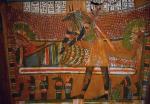 Бог бальзамирования Анубис, склонившийся над мумией. Роспись саркофага, 11 в. до н.э. Каир, Египетский музей