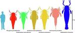 Гигантские палеозойские членистоногие по сравнению с ростом человека: а) морской скорпион Jaekelopterus rhenaniae, ранний девон, Германия; b) трилобит Isotelus rex, поздний ордовик, Манитоба, Канада; c) стрекоза Meganeura monyi, поздний карбон, Франция; d) многоножка Arthropleura armata, поздний карбон, Европа