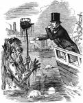 Фарадей дает визитку Духу Грязной Темзы. Карикатура из журнала «Punch», 21 июня 1855 года