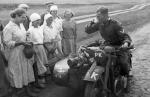 Украинские жители встречают немецкого фотографа из Роты Пропаганды. Обращает внимание утка на люльке мотоцикла, как значок Рот Пропаганды. Аббревиатура PK — Propaganda Kompanie переводится как Рота Пропаганды