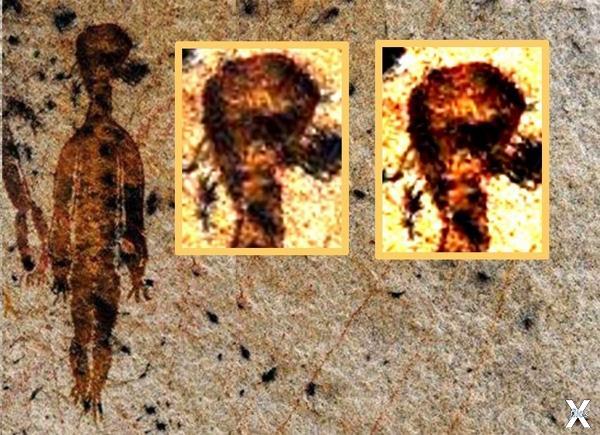"Рисунки выполнены натуральными (природными) красками, которые практически не выцвели, несмотря на прошедшие годы. На рисунках присутствуют необычные символы, а также видно, что группа инопланетян держит в руках некое оружие и имеет при себе различные технологические приспособления. У фигур практически нет носа, большие глаза и узкая прорезь рта. В общем, они напоминают классический портрет пришельца, каким его показывают в кино. Их принято называть "Серые".