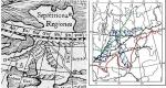 Рис. 6. Слева горная система Восточной Европы по Птолемею. Справа эти же горы (синий цвет) на фоне карты конечных морен различных ледниковых эпох