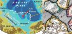 Рис. 7. Район многократного формирования ледниковых щитов на северо-восточном шельфе Азии (белый контур слева) соответствует одной из мифических земель на карте Г. Меркатора (справа)