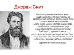 Карьера шла в гору, в 21 год Джордж Смит уже реставратор Британского Музея. Получает сложнейшее направление деятельности: из несметного числа «табличек», их осколков — составлять последовательные тексты, страницы глиняных книг. Его лингвистические познания скоро становятся предметом гордости Музея, задачи усложняются. Наступает осенью 1872 года. Джордж занят разбором археологического мусора из крошева глиняных табличек столицы Ассирии — Ниневии.