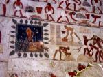 Фрагмент росписи гробницы Рехмета в долине знати: слева по центру водоем, откуда черпают жидкую смесь, внизу правее измельчают камень и носят крошку в кувшинах