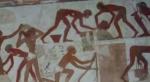 Следующий фрагмент росписи гробницы Рехмета в долине знати: готовую смесь носят кувшинами и заливают в формы, получая на выходе блоки (строитель с измерительным инструментом по центру внизу)