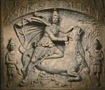 СЦЕНА УБИЕНИЯ БЫКА, изображенная на рельефе, обнаруженном в Западной Германии. Это изображение является главным в митраизме. Фигуры, соответствующие созвездиям и знакам зодиака, расположены по дуге над центральной фигурой божества. По мнению автора, это изображение связано с астрономическим явлением смещения точек равноденствия. Примерно к 2000 г. до н. э. точка весеннего равноденствия, прежде находившаяся в созвездии Тельца, переместилась в созвездие Овна. Те, кто исповедовал культ Митраса, считали, что их бог вызывает такое смещение. Сцена убиения быка символизирует это деяние Митраса