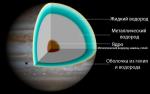 Нижние слои, как уже было сказано выше – океан сжиженных газов, а если бы наш корабль выдержал прохождение сквозь него, то он бы достиг следующей области – металлического водорода и гелия, толщина которой составляет около 40 000 км. Металлический водород и гелий образуются при давлении свыше миллиона атмосфер и высокой температуре. До сих пор точно никто не знает, какое ядро у Юпитера – скалистое твёрдое или там внутри жидкие металлы. Температура ядра и близлежащих к нему областей составляет от 28 000 С до 35 000 С.