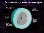 В самом центре Урана располагается маленькое силикатно-никелевое ядро, которое составляет половину массы Земли, и не зря эту планету величают ледяным гигантом, так как у него даже ядро «холодное» – его температура в пределах всего 5 000 С. На ядро приходится всего 20 % от всей планеты. Твёрдое ядро покрыто ледяной мантией, которая составляет 75 % всей планеты, но это не привычный лёд в нашем понимании: из-за сильного давления этот «лёд» представляет собой густую жидкость из льда, аммиака, метана и воды.