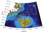 Океанические течения в районе Исландии-Гренландии. Красные стрелки - тёплые течения, синие - холодные