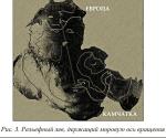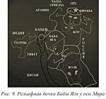 На верхней точке оси Мира находится бублик, на рельефе выбита стрелка его вращения. С другого конца ось стоит на ладони ребёнка у озера Байкал. Выше него находится морда льва, которая вписана в тор Руси, где найден Аркаим. Выше льва видна морда медведя, которая является кроной дуба. «Врата небесные» находятся в созвездии Малой Медведицы, ось Мира проходит через её Полярную звезду. Далее ось идёт через созвездие Льва, опираясь в его когтистую лапу (рис. 3):