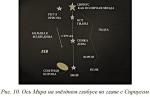 На звёздном глобусе оси с Полярной звездой и с Сириусом перпендикулярны. Положение осей Мира полностью соответствует расположению современных созвездий, если смотреть на Землю из космоса, чего пока люди не умеют делать. На звёздном глобусе ось с началом на Сириусе выглядит так (рис. 10):