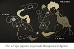 Персонажи «Сказки о Царе Салтане» выбиты рисунками на рельефе России и Африки. Три сестры сидят у огня на рельефе Центральной Африки (рис. 12):