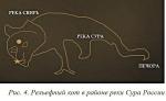 Такое расположение созвездий соответствует звёздному глобусу. Кот лежит на цепи - горной гряде Уральских гор. Ещё один кот находится на рельефе России, у рек Сура и Печора (рис. 4):