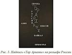 «Няня открыла ему путь к неиссякаемому источнику народного русского северного эпоса, веданию правил мироздания и путей восхождения к светоносным мирам. Сам А.С. Пушкин, по материнской линии, являлся носителем традиций египетского жречества(?). Он открыл нам возможность воспринимать то, что сокрыто за видимым миром явлений, проникать в миры смыслов и значений». Сказки и песни кота - это множество выбитых на рельефе букв (рис. 5):